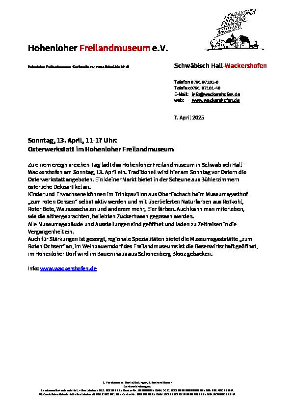 Am Sonntag, 13. April 2025 lädt das Hohenloher Freilandmuseum in Schwäbisch Hall-Wackershofen wieder zur traditionellen Osterwerkstatt ein.
